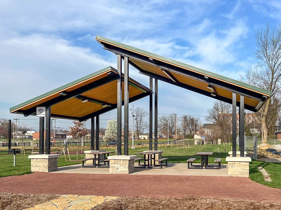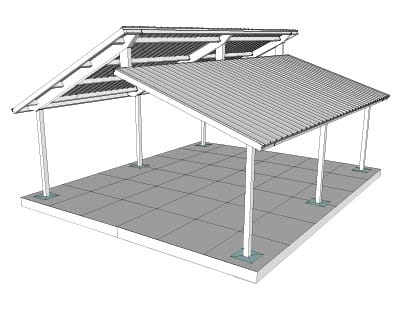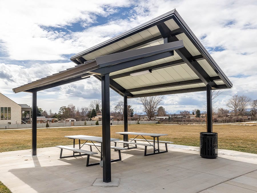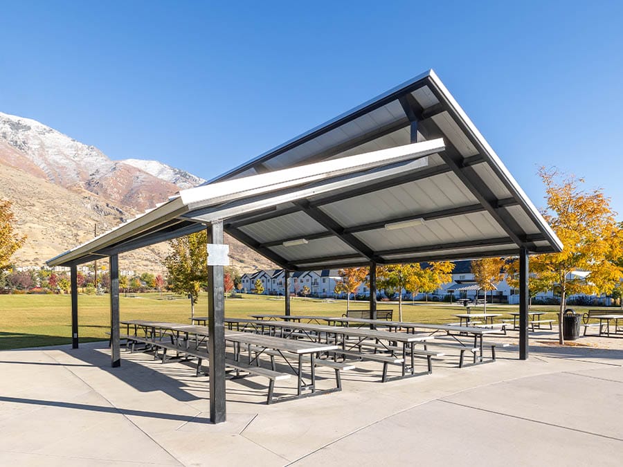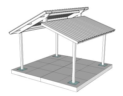Clerestory pavilions feature two sloping roof sections set at different heights, connected by a short vertical wall between them. Inspired by mid-century modern architecture, this design maximizes natural light while promoting airflow and ventilation. The result is a bright, open structure that blends modern design with the timeless features of a classic pavilion.