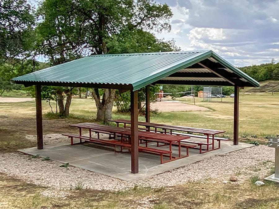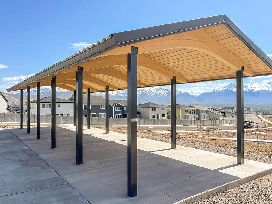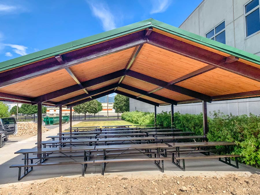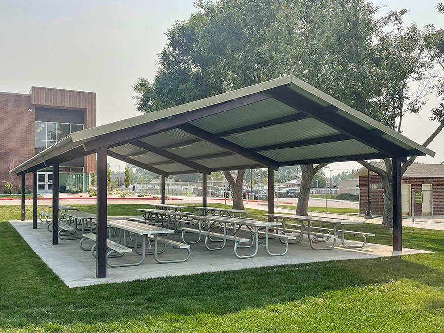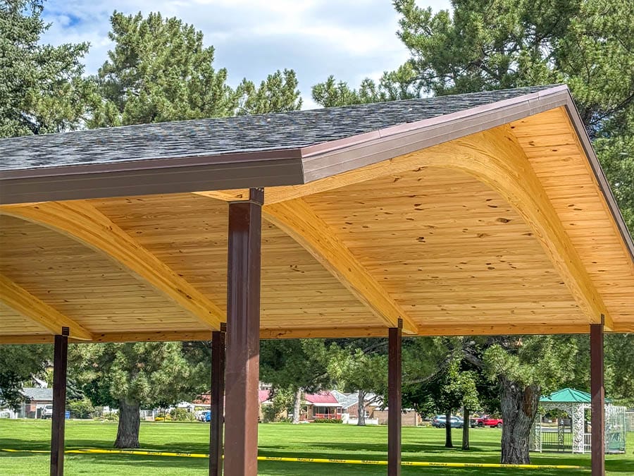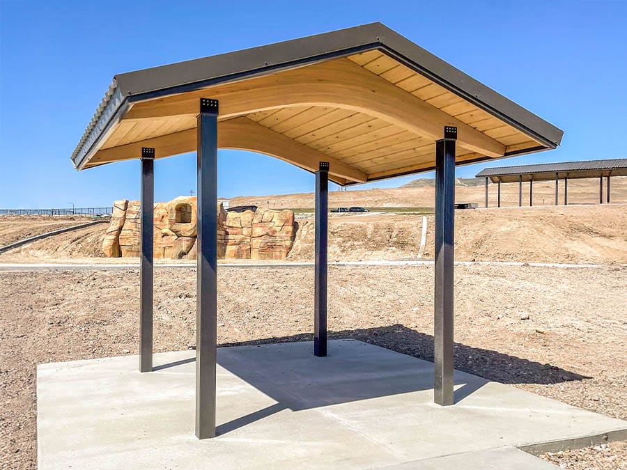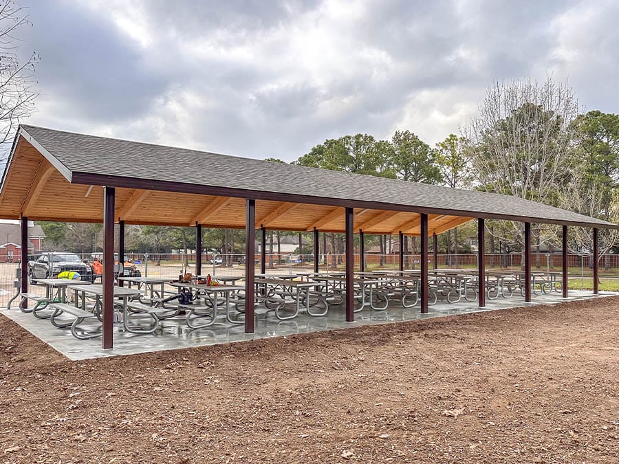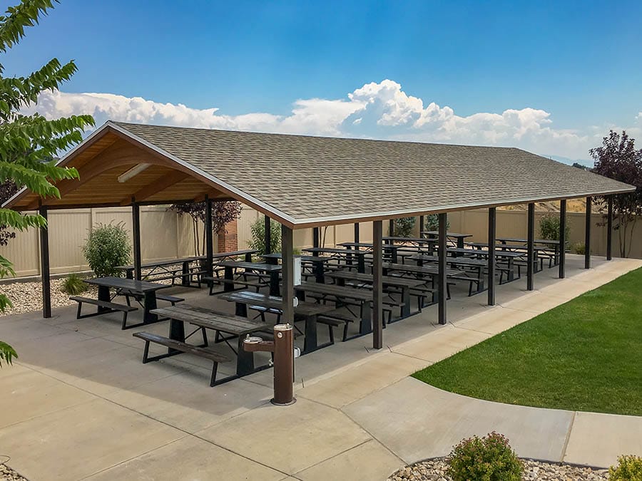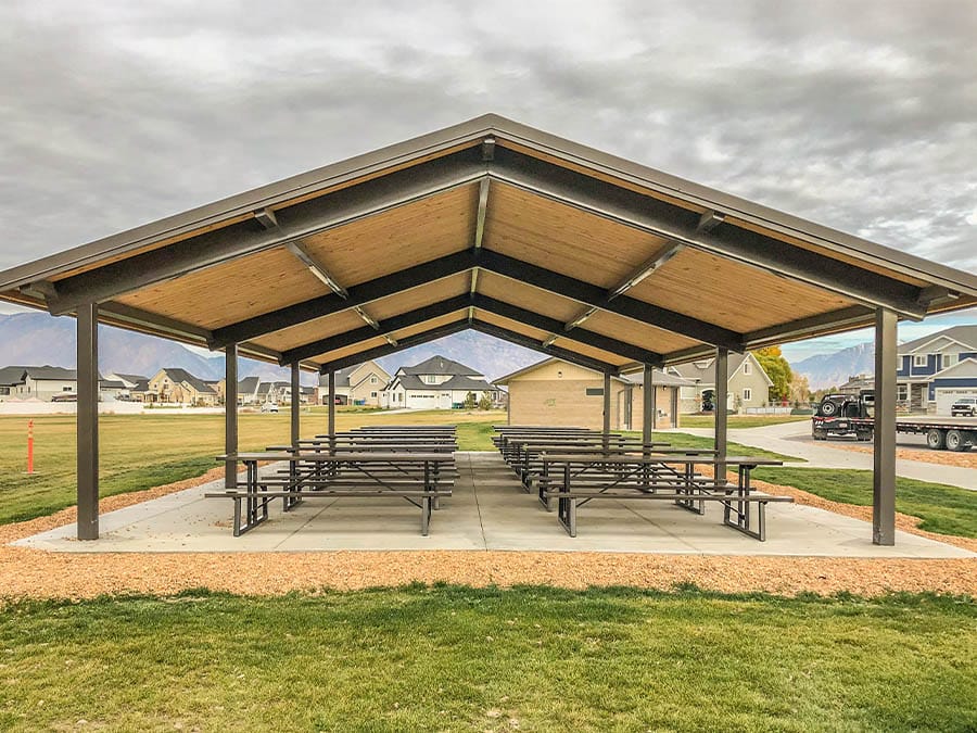 Gable pavilions feature a classic A-frame roof with two sloping sides that meet at a central ridge, creating a distinctive triangular peak. The vaulted ceiling provides an open, spacious feel, making them ideal for gatherings. Built with a strong post-and-beam structure, they can be designed with wood or steel beams to match your needs. Their timeless look makes gable pavilions a popular choice for business fronts, parks, school campuses, and other public or commercial spaces.