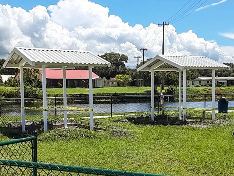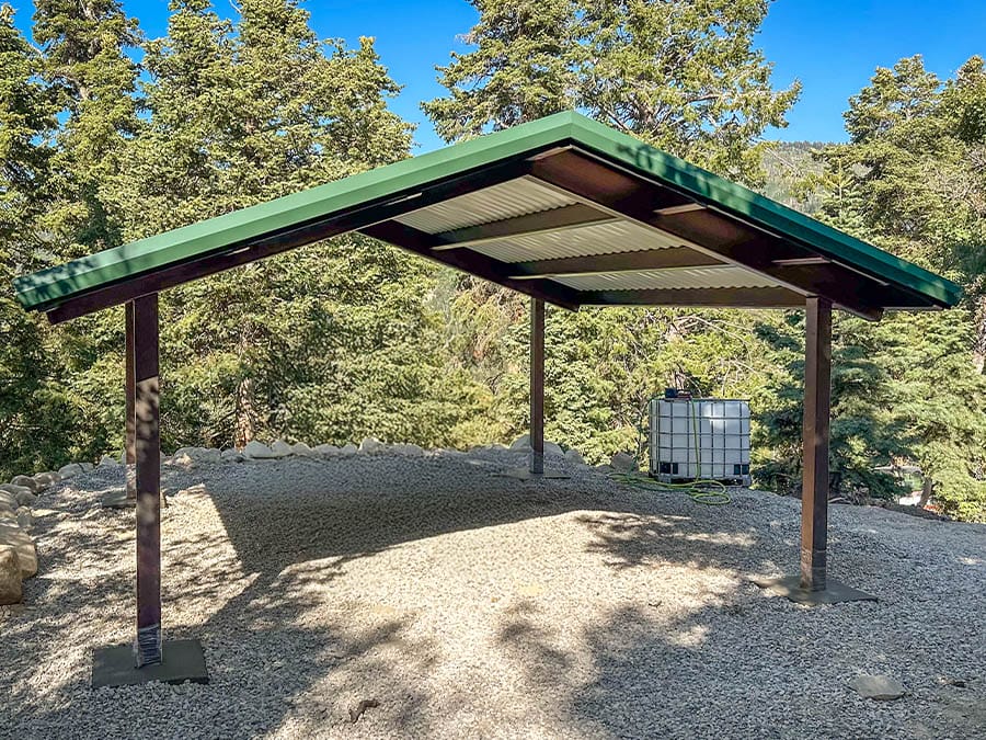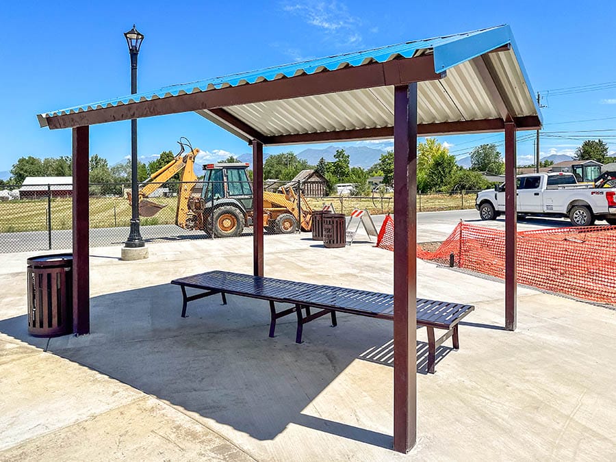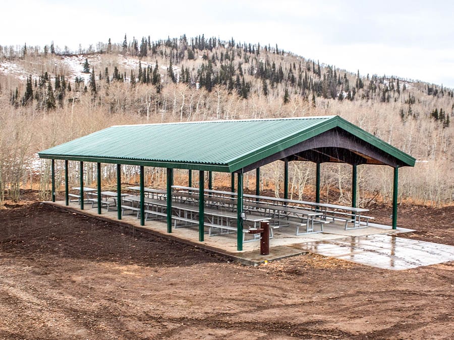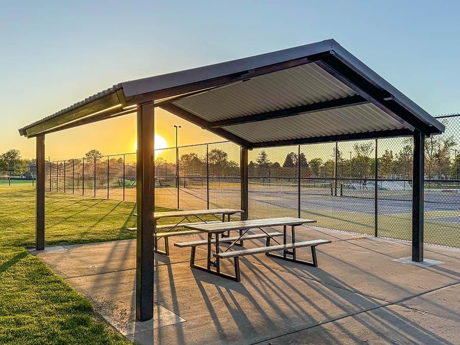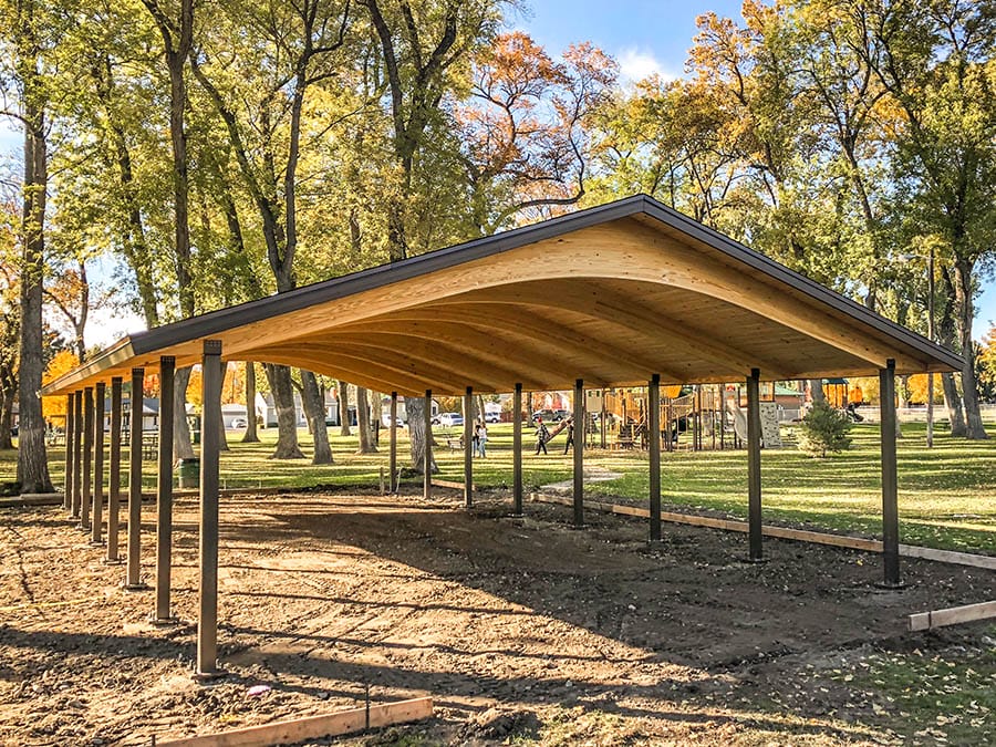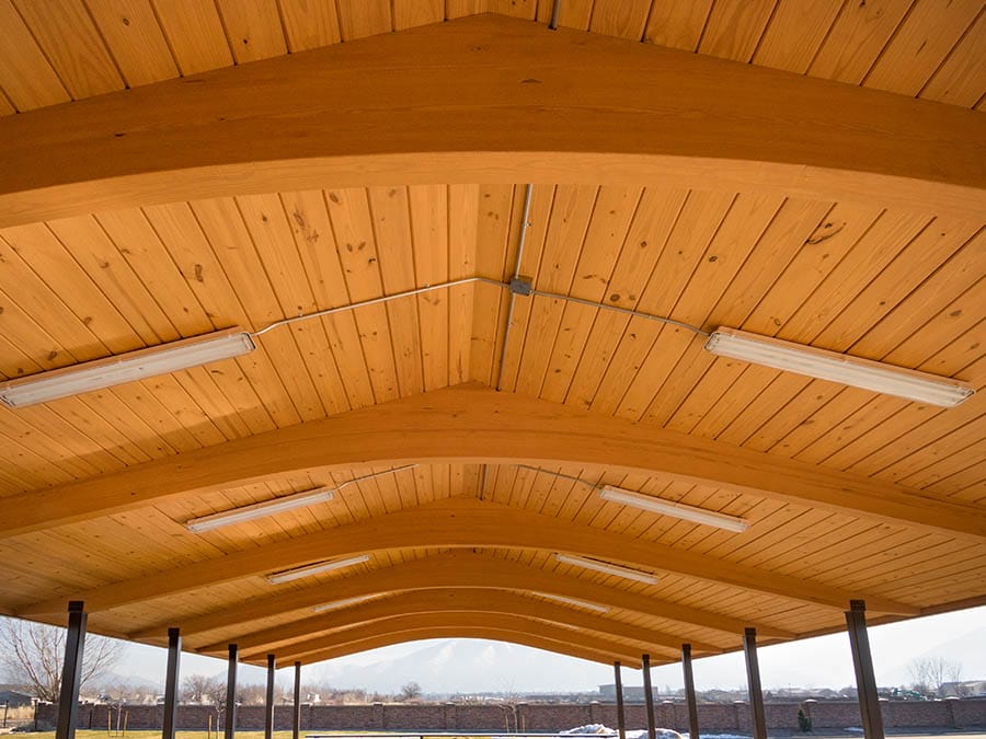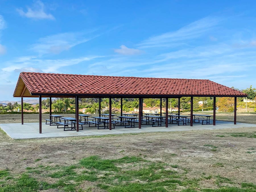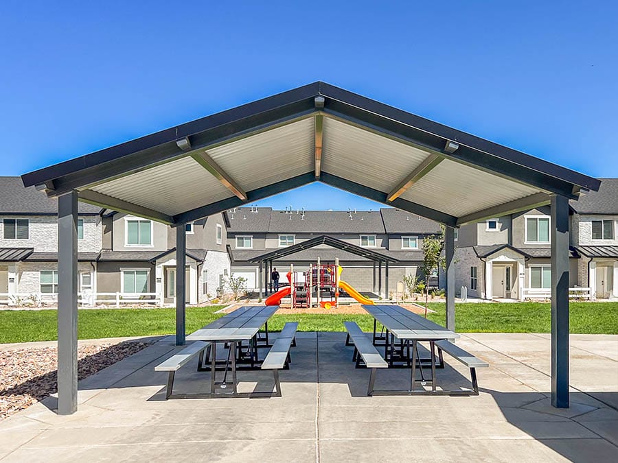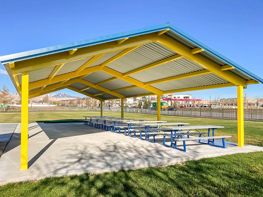 Gable pavilions feature a classic A-frame roof with two sloping sides that meet at a central ridge, creating a distinctive triangular peak. The vaulted ceiling provides an open, spacious feel, making them ideal for gatherings. Built with a strong post-and-beam structure, they can be designed with wood or steel beams to match your needs. Their timeless look makes gable pavilions a popular choice for business fronts, parks, school campuses, and other public or commercial spaces.