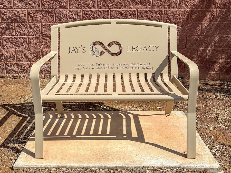 Each memorial bench is specially sandblasted, primed, and powder coated to protect the metal from harsh weathering for years to come. The thick coating of the powder coat is resistant to chips, scratches, and rust.