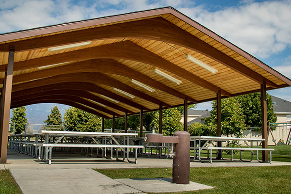 Glulam Beam Structures have a gable roof with a Glulam Beam deck underneath. This is our most popular picnic shade structure.