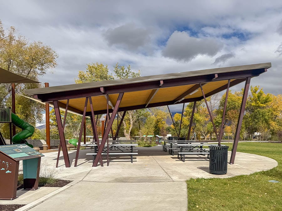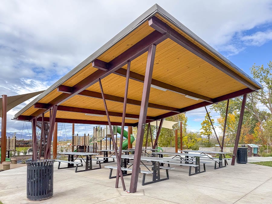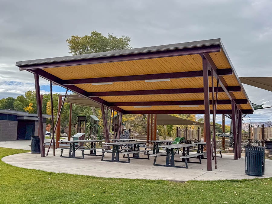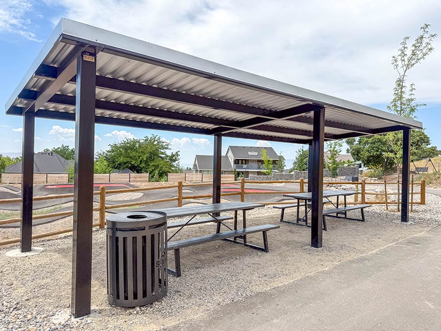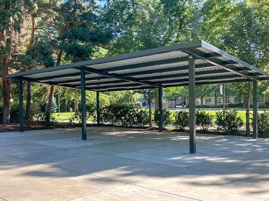 Single-slope pavilions, also known as mono-pitch or lean-to roofs, feature a single roof plane that slopes in one direction. This design promotes efficient drainage while providing protection from sun, snow, and other weather conditions. Single-slope pavilions are a great option for bike racks, picnic tables, college campuses, bike parks, and event-center style spaces.