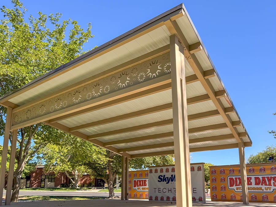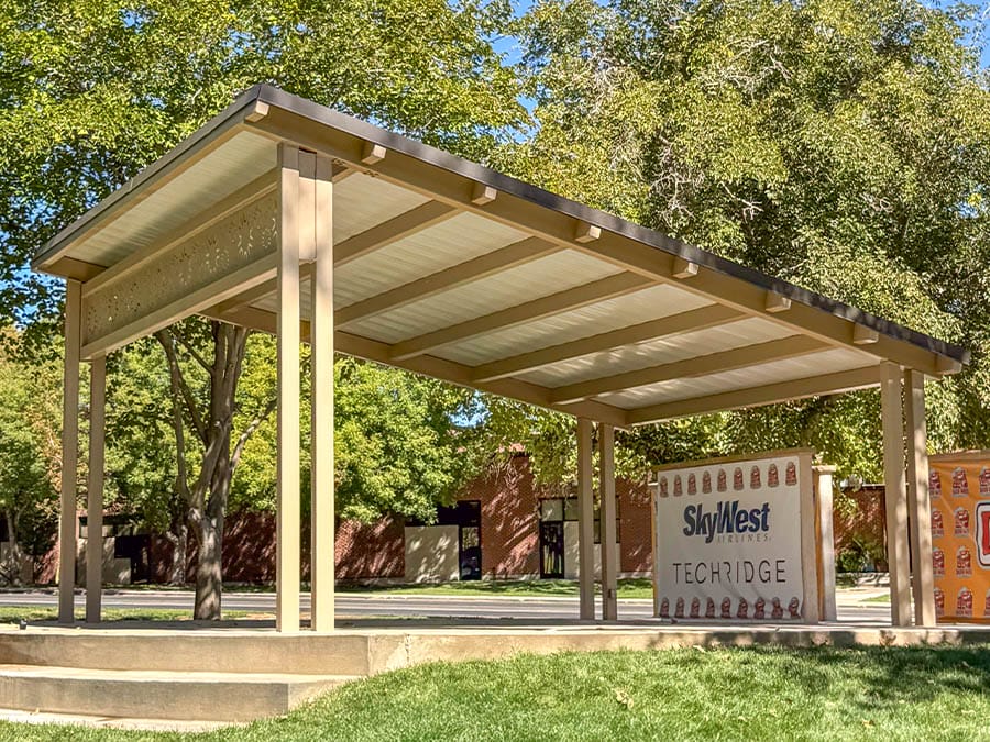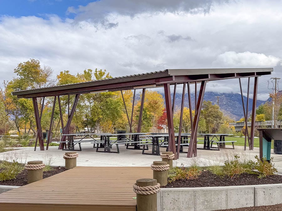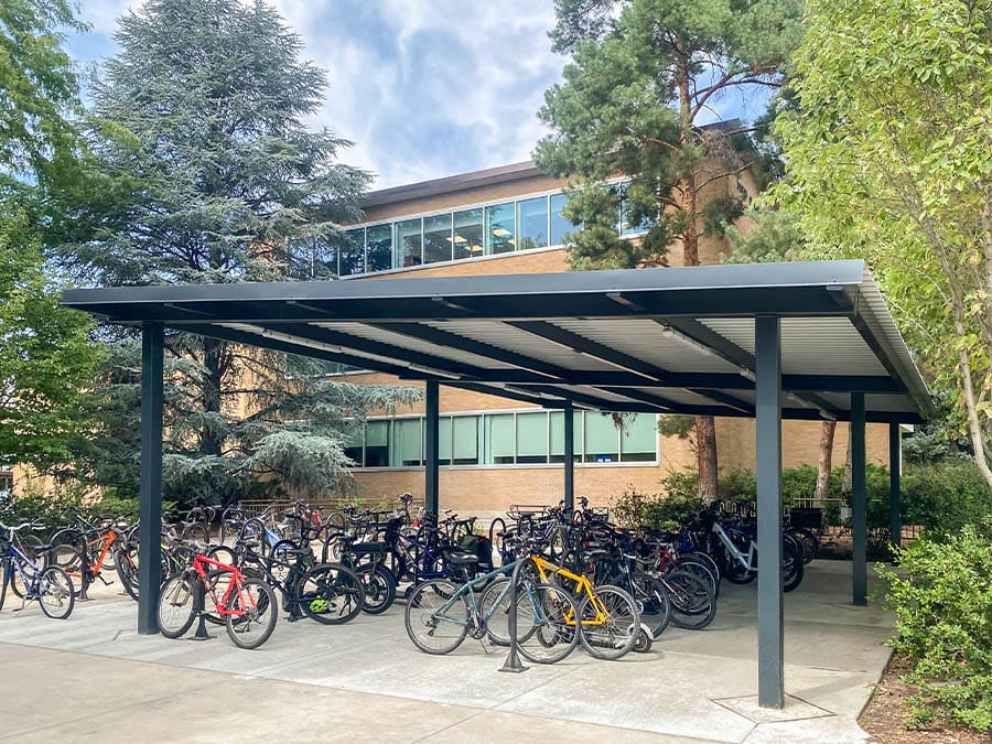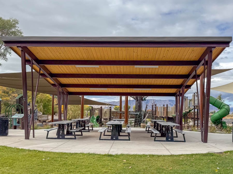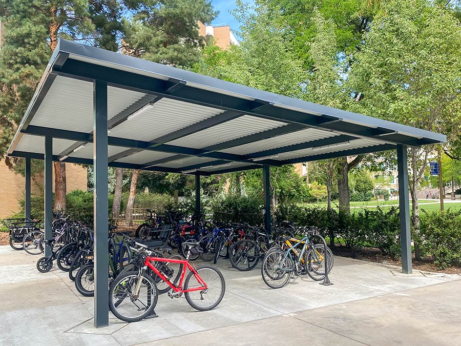 Single-slope pavilions, also known as mono-pitch or lean-to roofs, feature a single roof plane that slopes in one direction. This design promotes efficient drainage while providing protection from sun, snow, and other weather conditions. Single-slope pavilions are a great option for bike racks, picnic tables, college campuses, bike parks, and event-center style spaces.